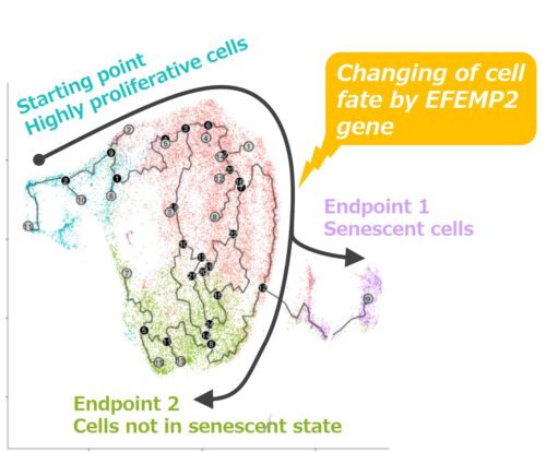 Using a technique called pseudotime analysis, and based on gene expression patterns, we analyzed the sorts of changes in cell conditions that follow on with aging in a cell population with high proliferative activity that was set as the starting point. As a result, the existence of two presumptive differentiation pathways (cell fates) was inferred, with senescent cells as an endpoint (endpoint 1) and cells not in the senescent state as the other endpoint (endpoint 2) (Fig. 1). Thereafter, focusing on the EFEMP2 gene characteristic of endpoint 2 cells not in the senescent state, the cell senescence state when the expression of the gene was not suppressed was evaluated. As a result, fibroblasts in which the expression of EFEMP2 was suppressed showed an increase in cells exhibiting characteristics of senescent cells, indicating that EFEMP2 is involved in changing the senescence fate of fibroblasts (Fig. 3).This increase in senescent cells due to the suppression of EFEMP2 has also been found in dermal fibroblasts derived from other cell donors.