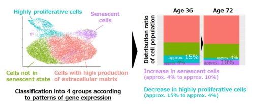 Based on the patterns of gene expression, fibroblasts were broadly divided into four groups: (1) highly proliferative cells, (2) cells with high production of extracellular matrix*1, (3) senescent cells, and (4) cells that were not in a senescent state. The main changes that were indicated in fibroblasts due to aging were an increase in senescent cells, a decrease in highly proliferative cells, and a decrease in functions such as the production of extracellular matrix. For example, when comparing fibroblasts at ages 36 and 72, results were that the proportion of senescent cells increased from approximately 4% to approximately 10%, and the proportion of highly proliferative cells decreased from approximately 15% to approximately 4% (Fig. 2).