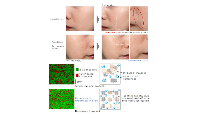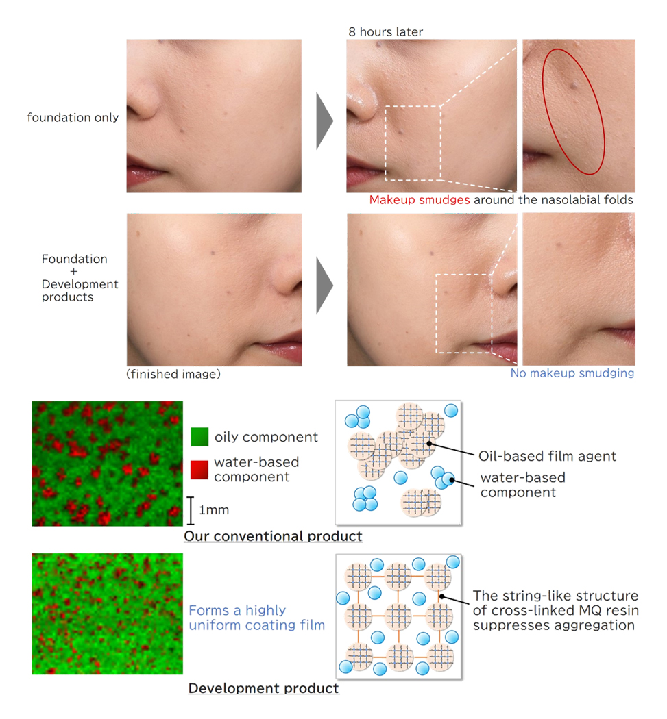 “No matter how beautifully my makeup is done, it will come off.” At KOSÉ, we are developing technologies that address the needs of our customers. To date, we have developed “Make Keep Mist,” a sweat-resistant, two-layer type mist that prevents makeup from coming off, and the product has led the market with its high functionality and ease of use. In order to further enhance the effect of preventing the makeup from “becoming patchy” by facial movements over time, we have developed “cross-linked MQ Resin,” a new material that creates tough yet flexible coating layer. This also leads to the formation of a highly uniform coating film and a quality that does not feel burdensome even when worn for long periods of time. The new material has been applied to the renewal of this product.
