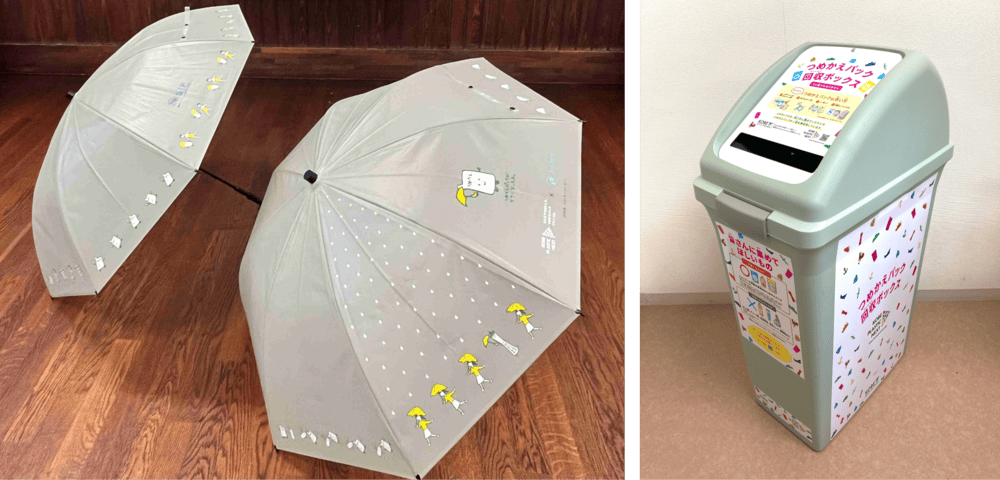Recycled umbrellas and collection boxes made from recycled resin from used refill packs.