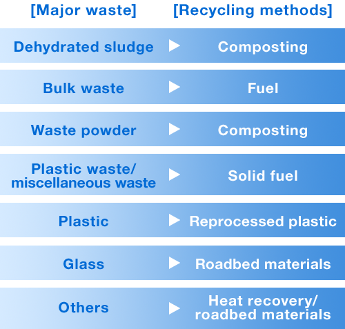 KOSÉ’s manufacturing sites place emphasis on recycling with the aim of using recycled materials for the benefit of society, rather than simply disposing of generated waste. The greatest efforts are focused on material recycling, combined with chemical and thermal recycling, to minimize landfill waste and simple disposal. Based on this basic policy, each worksite is required to sort out waste into recyclable or non-recyclable prior to collection to improve the recycling rate and reduce industrial waste. We regularly review recycling companies and visit waste treatment firms for on-site inspection to ensure proper waste treatment.