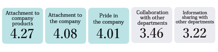 At KOSÉ, we regard employees as an important asset and foundation that supports the enhancement of corporate value. We believe that increasing employee engagement and willingness to contribute will revitalize the organization and strengthen competitiveness. Therefore, with the aim of creating a comfortable and rewarding workplace, we regularly conduct employee awareness surveys and 360-degree evaluations. The results of the survey are reported to management and the Management Policy Review Committee, where the results are analyzed, issues organized, and measures examined and taken. The fiscal 2024 survey found that loyalty to the Company and sense of fulfillment in work tended to be higher than the average value for society as a whole, also show that while our employees take pride in working for KOSÉ and feel a strong connection to our products, there is room for improvement in cross-departmental collaboration.