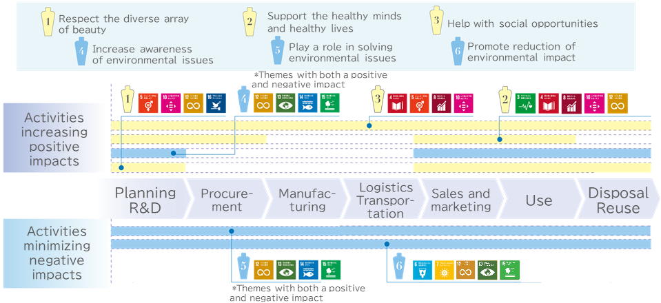| Support the healthy minds and healthy lives | Pursue activities where the people of society can experience well-being through beauty | No. of initiatives for achieving well-being | 500 or more activities | 2030 |