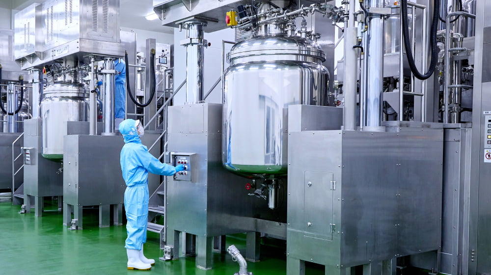 製品ごと、設備ごとに工程が定められており、順序通りに投入し温度・回転速度を調整しながら「乳化」や「混合」などを行います。