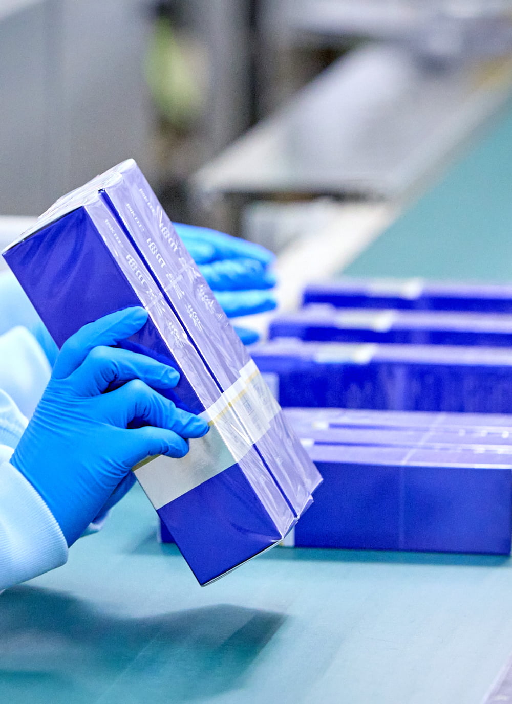 標準書(手順書)に基づき生産設備を準備し、規格通りにバルクを容器へ充填します。その後、化粧箱へ挿入やフィルム包装の工程を行い、段ボールに詰め、出荷準備が完了します。