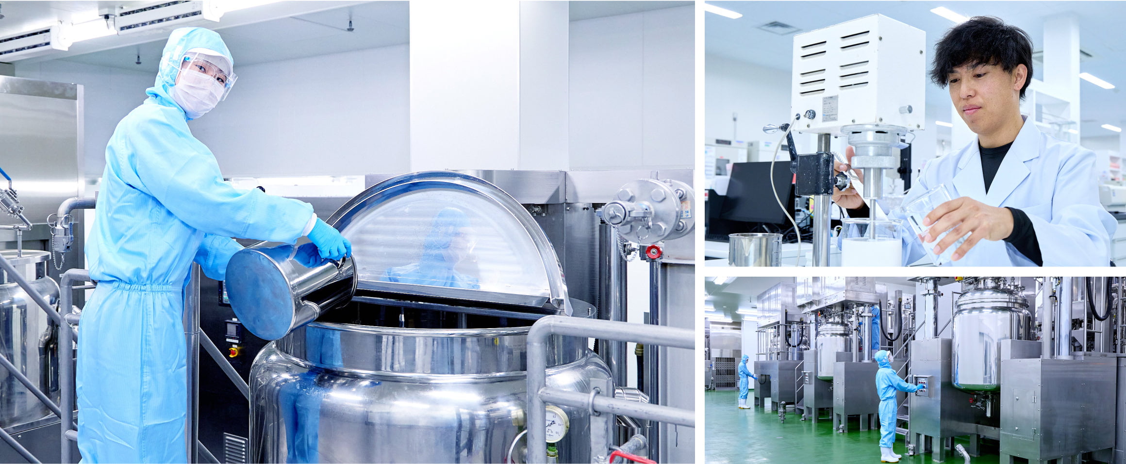 バルク(化粧品の中身)の量産とその具現化に関わるお仕事です。新製品を工場量産に移行する生産プロセスの立案や新規生産技術の提案・開発を行います。量産では配合処方に基づき定められた工程でバルクを作り上げます。スキンケア・ヘアケア・ベースメイク・ポイントメイクなど、お客さまに安心してご使用頂けるバルクを作る技術者として重要な業務を行っています。