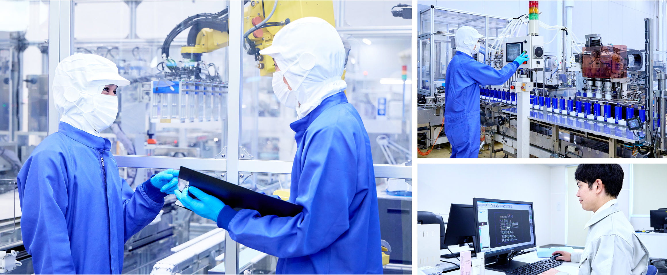 多種多様なパッケージに対応して充填・包装の具現化に関わるお仕事です。スキンケア・メイク化粧品を生産する上で充填・包装は最も美観性が求められる化粧品らしさを形づくる工程です。商品デザインの設計段階から関わり、工場のラインで生産できる様に新規設備開発、工程開発・設計等にてクリエイティブな役割を担います。量産では機械化条件に基づいた生産機器のオペレーションや新規設備の導入等、お客さまにご使用いただく化粧品の充填・成型・パッケージングなど、重要な業務を行います。