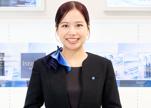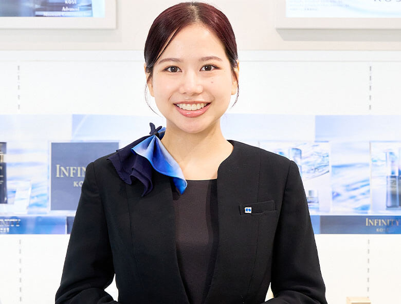 就職活動では化粧品メーカーの営業職や販売職に興味を持っていましたが、コーセーの説明会の雰囲気や、実際に店頭に伺った際、スタッフの方が丁寧に肌診断やカウンセリングをしてくれ、緊張していた私にも優しく接してくれたことに感動して「私もコーセーのビューティコンサルタントを目指したい!」と強く感じたことを覚えています。面接では、その時の想いや自分のなりたい姿を、熱く伝えることができたと思います!