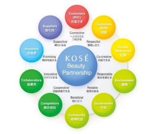 このあらゆるステークホルダーと良好な信頼関係を構築しようとする姿勢は当社のDNAとして脈々と受け継がれており、現在では、当社の価値観である『KOSÉ Beauty Partnership』としても表現されています。