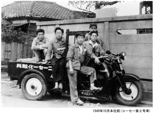 そこで、孝三郎は、高橋東洋堂の退職金と戦災で焼けた自宅の火災保険などを元手に、法人登記ギリギリのタイミングの3月2日に資本金10万円で社員4名の小林合名会社をつくりました。ついにコーセーが誕生したのです。1948年には資本金を150万円に増資し、株式会社小林コーセーが設立されました。