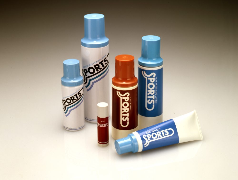 1970年代に入ると、スポーツは一部のアスリートや学生だけのものではなくなりました。現上皇・上皇后両陛下の出会いに象徴されるテニスブームは、軽井沢を聖地として全国へ波及。白いウェアに身を包み、健康的でアクティブな休日を謳歌することが、若者たちの憧れのライフスタイルとなったのです。こうした『日常の中で美しく汗を流す』という新しい文化の広がりを、コーセーはいち早く捉えていました。1976年、強い太陽を浴びるレジャーに向けたシリーズ「スポーツ」を発売し、化粧品分野で「スポーツ/SPORTS」を商標登録しています。コーセーにとって、スポーツは単なる流行ではなく、美の新しい領域だったのです。