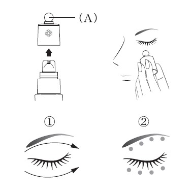 - 美容液をなじませたあと、(A)を使用し、 下まぶた、上まぶたそれぞれの目頭から目のまわりの骨のふちにそって、矢印の方向に3回軽く動かす。