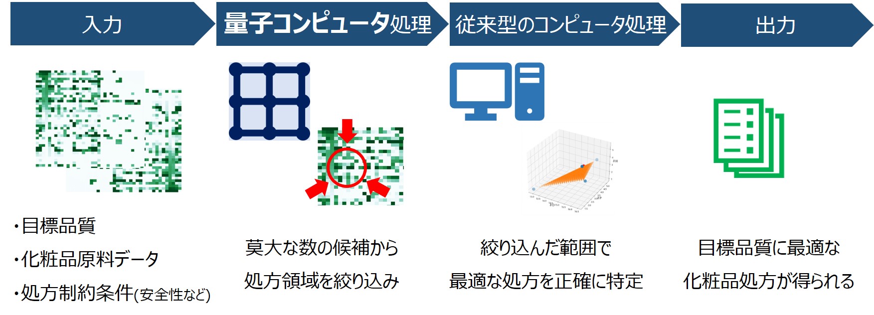 量子コンピューティング技術は発展途上であり、現時点では量子コンピュータ単体で計算される解には精度面で課題が残ります。一方で、従来型のコンピュータでは莫大な候補の中から解を探すのに多くの時間を要してしまいます。そこで、量子コンピュータと従来型のコンピュータのそれぞれの利点を組み合わせたハイブリッド型の独自アルゴリズムを開発しました(図1)。このアルゴリズムは、量子コンピュータの強みである高速な演算能力を活かし、無数にある原料の組合せの探索領域を目標品質に合わせて高速で絞り込み、続いて、従来型のコンピュータを用いて絞り込んだ中で目標品質に最適な処方を正確に生成させることができます。これにより、これまでは実用的な時間では計算が困難であった自動処方生成を、量子コンピューティング技術を活用することで実現できるようになりました。