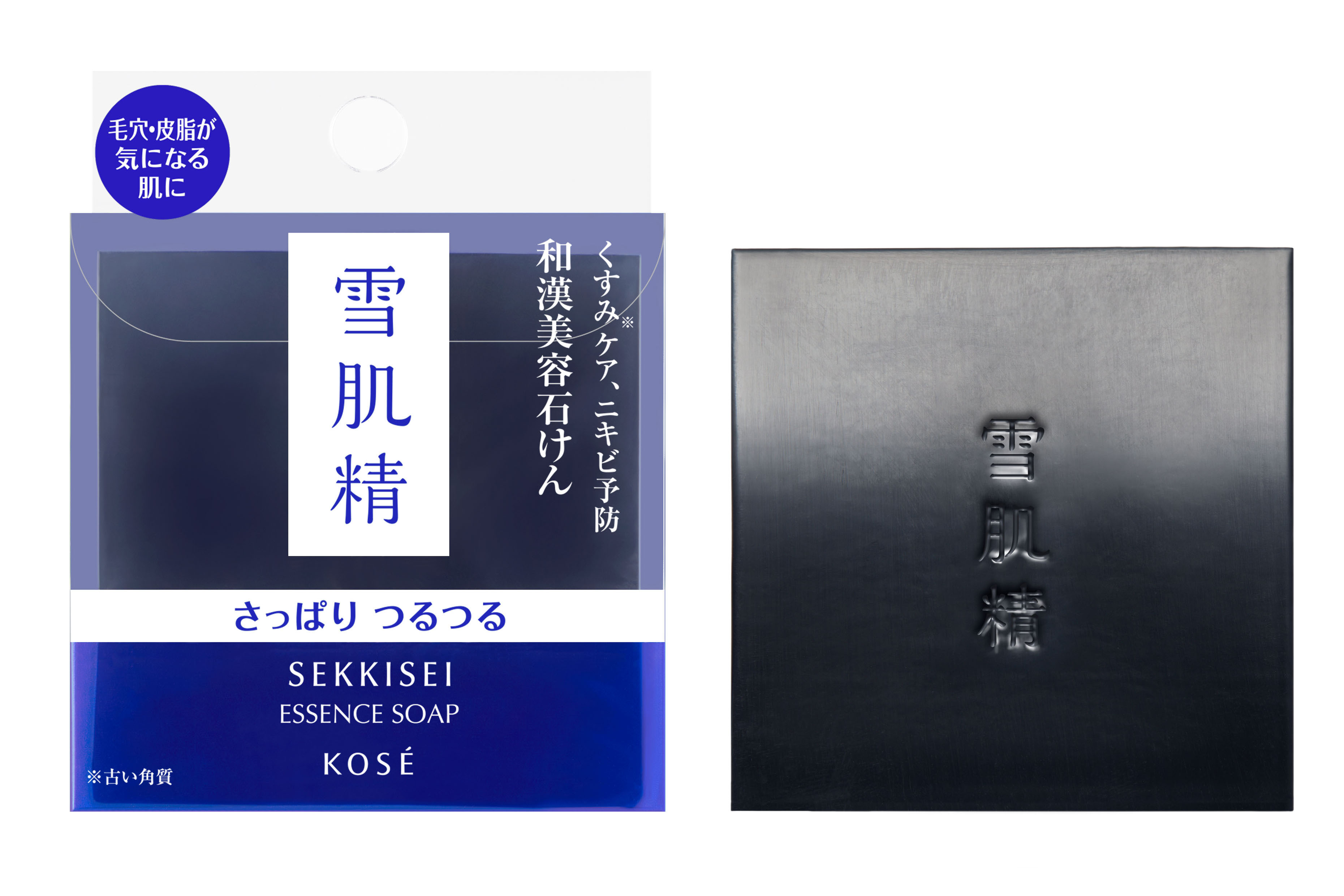 「雪肌精 エッセンス ソープ」は、和漢植物エキス※2を配合、みずみずしくさっぱりとした洗い上がりと格調高い黒い外観、香りは、かつての「清肌晶 石けん」をそのままに、新たに皮脂吸着効果のある炭を配合しました。和漢植物エキスを含んだやさしい泡が、肌をくすませるメラニンを含む古い角質、毛穴の皮脂よごれを取り除き、つっぱり感のないなめらかな肌に整えます。洗顔の後、次に使用するスキンケアの肌なじみも高めます。
