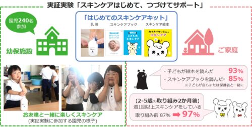 本実証実験は2022年10月19日から11月18日までの1ヶ月間で実施し、幼保連携型認定こども園「たかさごスクールおおたかの森」(千葉県流山市)の0歳児から5歳児クラスまでの240名(各クラス30~50名)の園児が参加しました。幼保施設と各家庭に「はじめてのスキンケアキット」(乳液・スキンケアブック・スキンケア絵本のセット)を配布し、幼保施設では保育者によるサポートの下、手洗いや食事後・着替え等のタイミングで乳液の塗布を行いました。また、子どもが自らの肌やスキンケアへの関心を持てるように、保育時間の中でスキンケア絵本の読み聞かせなどの取り組みを実施しました。