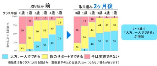 続いて、子どもの自発的なスキンケアの実践度合いを保護者の視点で評価してもらいました(図3)。取り組み前は、0~1歳児クラスでは多くの保護者が「親のサポートが必要」もしくは「実施できない」と回答しました。2歳児クラスでは29%が「大方、一人でできる」と回答し、スキンケアの自立が始まっている可能性が確認できました。