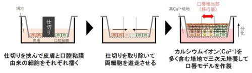 唇部分を再現するため、皮膚と口腔粘膜に由来する細胞を共存させる手法を採用しました。まず、仕切りを境に、皮膚と口腔粘膜に由来する細胞をそれぞれ仕切りの両側に播き、仕切りを外すことで両側から、仕切りがあった部分へ細胞を自発的に遊走(別の位置に移動すること)させました。その後、空気中で培養することで、口唇に相当する部分を作製しました(図2)。構築した口唇モデルを組織染色したところ、それぞれ実際の皮膚、口唇、口腔粘膜に類似した構造や特徴を有していることが分かりました(図1)。