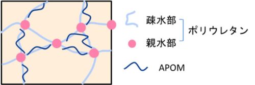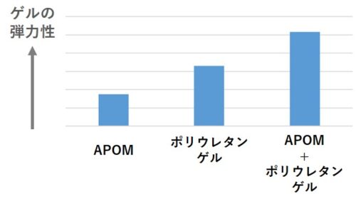 APOMは透明性、密着性、均一な膜形成に優れており、結晶性を持たないため、高配合により強度を高めても、透明性を維持できる特長をもっています。また、ポリウレタンは油剤を含むことで動きに追従するような柔軟なゲルを形成することができます。そこで、まずはこれらを組み合わせることで目もとの動きにも耐えられる柔軟なゲルの作製を検討しました。その結果、両者を特定の比率で共存させることで、それぞれを単独でゲル化したときよりも高い弾力を持つ複合ゲルを形成できることを見出しました(図2)。これはポリウレタンの構造内の疎水部分(水を弾く部分)にAPOMが密着することで補強されたためと考えられます(図3)。