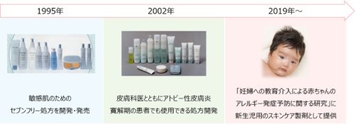 本試験で提供したスキンケア製剤は、25年以上になる当社の敏感肌に向けた研究が応用されています。1995年に発売された敏感肌向けのセブンフリー処方(刺激になりうる7つの成分種をできる限り低減した処方)を実現した製剤・保証研究をはじめ、2002年には皮膚科医と連携してアトピー性皮膚炎の寛解期(一時的に症状がおさまっている状態)の患者でも使用できることを確かめたスキンケア処方を開発しました(図3)。このような研究知見を応用したのが今回のスキンケア製剤であり、生まれたばかりの新生児の肌でも安全に使用できることを確認することができました。