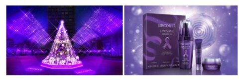 啓発活動においては、昨年に続き、パープル・ライトアップ「DECORTÉ Purple Lightup 2023」を開催。「MIYASHITA CHRISTMAS PARK 2023」と連動し、テーマ「LOVE PURPLE※2」に合わせ、同運動のシンボルである「パープルリボン」と、ブランドを代表する“リポソーム美容液”を象徴するパープルのカラーで宮下公園を彩ります。今年はエリアを拡大し、新たなデザインのクリスマスツリーや、巨大なリポソームのフォトスポットなども登場します。また、商業施設「RAYARD MIYASHITA PARK」のNorth 2階・3階でもパープルカラーをテーマにしたイルミネーションが実施される他、ホテル「sequence MIYASHITA PARK」でも、エントランス照明や館内のクリスマス装飾をパープルに統一し、MIYASHITA PARK全体がパープルにライトアップされている様子をお楽しみいただけます。