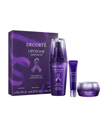 2021年のリニューアル発売以降も、多くの支持を集めているエイジングケア美容液リポソーム アドバンスト リペアセラム※4」(本品)と、「リポソーム アドバンスト リペアクリーム※5」「リポソーム アドバンスト リペアアイセラム※6」のトライアルサイズがセットになった限定品です。本年はパッケージに加え、ボトルにもパープルリボンをあしらいました。