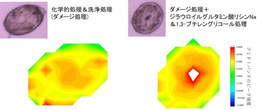 内部タンパク質の流出に対応するため、補修成分の検討を行いました。化学的処理と洗浄処理を行ったダメージまつ毛に対し、タンパク質の材料であるアミノ酸から作られ浸透性に優れた成分ジラウロイルグルタミン酸リシンNaを1,3-ブチレングリコールと共に作用させたところ、成分がまつ毛の内部にまで浸透したことを示す結果が得られました(図3)。