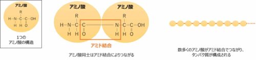 タンパク質は多数のアミノ酸が結合してつながることで構成されており、アミノ酸同士をつなぐ結合をアミド結合という。