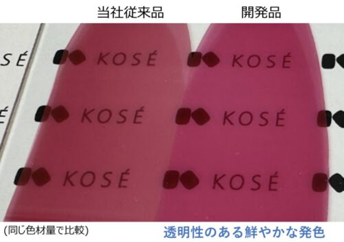 開発した分散技術を用いて、作製した口紅(開発品)の「彩度」と「透明性」を検証しました。まず、透明なガラス板の上に口紅で化粧膜を引き、それを従来の工程で作製した同じ色材量を含む口紅(従来品)と比較しました。その結果、同じ色材量にも関わらず、開発品は従来品に比べて彩度が向上しており、より鮮やかな発色と透明性を両立することができました(図1)。