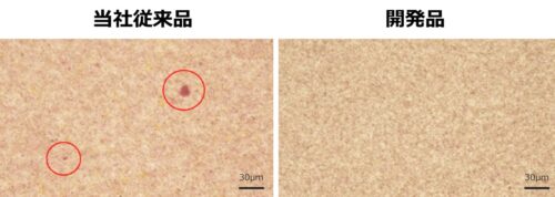 口紅に色を付与する色材は粉体であり、同じ色材量でも製品中での分散性(散らばり具合)が良い方が口紅として鮮やかに発色させることができます。そこで分散に用いる機器や工程を根本的に見直すことで分散性の向上を図りました。その結果、色材の分散性が飛躍的に向上し、マイクロスコープで口紅中の色材を観察したところ、従来の工程による口紅では少数ながら色材の塊が点在しているのに対し、開発した工程では色材は均一に細かく分散していることが確認できました(図2)。