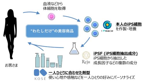 本取り組みの狙いは、お客さまにとって“わたしだけ”の美容商品を提供することです。お客さまは自身の血液などから採取した体細胞からiPS細胞を作製し、そこから抽出された成分を美容商品として享受することができます。iPS細胞は作製過程で細胞の若返りが起きるため、自身の若い時と同様に活性化した細胞を活用できるメリットに加え、自分自身のiPS細胞から得られる「iPSF」は生体適合性が高く、安全性が高いという利点があります。体細胞から個人のiPS細胞を作製し、培養・管理する部分はアイ・ピースが担います。同社が既に個人向けのiPS細胞のバンキング事業で行っている、安全で効率的な作製・管理プロセスが活かされます。美容商品に配合される「iPSF」の製造と提供はアイ・ピースと技術提携をしているレジュが担います。