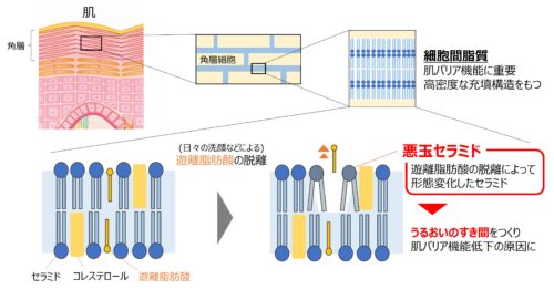 細胞間脂質の低密度化の原因は、形態変化した「悪玉セラミド」であることを発見