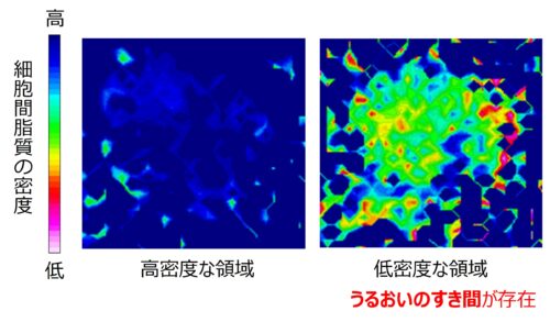 一方、肌バリア機能の低下は健常者においても普段の洗顔などで日常的に起こりうる現象であり、当社ではバリア機能低下と細胞間脂質の充填構造の関係に着目した研究を進めてきました。既に赤外分光法を用いることで、細胞間脂質の充填密度を可視化することに成功しており、肌の中で密度が高い領域と低い領域が存在していることを確認しています(図2)。この低密度の領域は、バリア機能が低く、乾燥が起きやすい「うるおいのすき間」と言えますが、なぜこのすき間が生じるかは解明されていませんでした。そこで本研究ではこの原因解明とその対応策について探求しました。