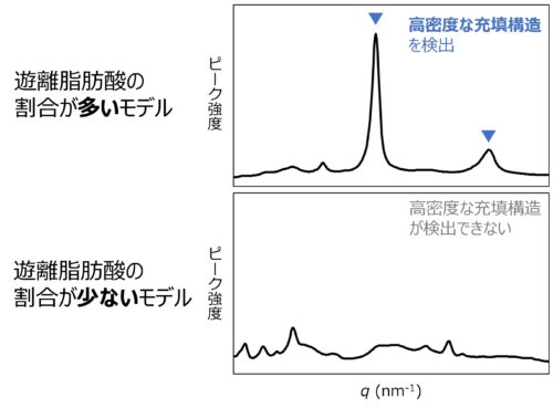 細胞間脂質の充填構造と構成成分の関係を調査しました。主要構成成分であるセラミド、コレステロール、遊離脂肪酸の割合を変化させた細胞間脂質モデルを複数作製し、各モデルの充填構造をX線小角・広角散乱測定により解析しました。その結果、遊離脂肪酸の割合が高いモデルでは高密度な充填構造を示すシグナルが検出され、一方割合の低いモデルでは高密度な充填構造は検出されませんでした(図3)。このことから、遊離脂肪酸の存在が高密度な充填構造に大きく関与していることが分かりました。