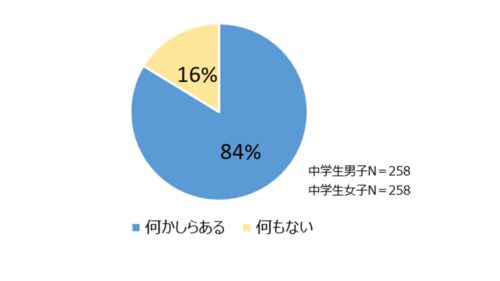 「肌悩みはあるか?」という設問に対し、8割超の中学生男女(男子:81%、女子:86%)が「何かしらある」と回答しました。なお、高校生男女では9割超が「何かしらある」と回答しています。