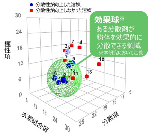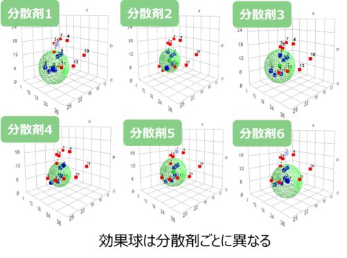 また、溶媒中の粉体の分散性は、その粒子径を測定することで評価することができるため、粉体に分散剤を添加したときに粒子径が小さくなっていれば、効果的な分散剤であると評価することができます。本研究では、ある粉体に対し、溶媒と分散剤の様々な組み合わせを試行し、それぞれの粒子径の変化率を評価しました。その結果、分散剤ごとに粒子径を小さくした溶媒の集合、つまり効果的に粉体が分散できる領域を見出しました。この領域は球形となり、この内部は効果的な粉体分散になると推定されることから、これを分散剤の「効果球」と定義しました(図1)。この効果球は分散剤ごとに異なるため(図2)、効果的な粉体分散のためには分散剤選択が重要となることが再確認できました。