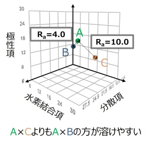 ハンセンの溶解度パラメータは、それぞれの物質の持つ凝集エネルギー(寄り集まろうとする力)を分散項・極性項・水素結合項という3種類の化学的な性質によって数値化したものです。この各項を軸とした三次元空間における、物質同士の点の距離Raを比較することで、どの物質同士が溶けやすいかという親和性を推測することができます(図3)。