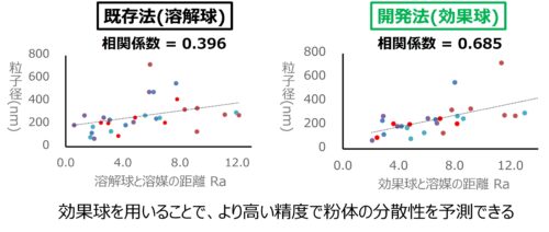 次に効果球が粉体分散をどの程度予測できるのかを検証するため、分散剤と溶媒の組み合わせを変えながら、粉体の粒子径と効果球と溶媒の距離Raの関係を調べました。その結果、今回開発した効果球を用いた手法は、既存の溶媒への溶解性を基準にした方法(溶解球)と比較して、Raと粒子径の間により強い相関が確認できました(図4)。これは、溶解性を基準にした方法は分散剤が溶媒に溶けすぎてしまい、粉体表面で分散に寄与できない部分を考慮しきれないのに対し、効果球の方では分散剤が粉体表面で効果的に分散に寄与できる状態を正しく評価できたためであると考えます。以上から、粉体分散を予測する有効な手法として効果球を開発することができました。