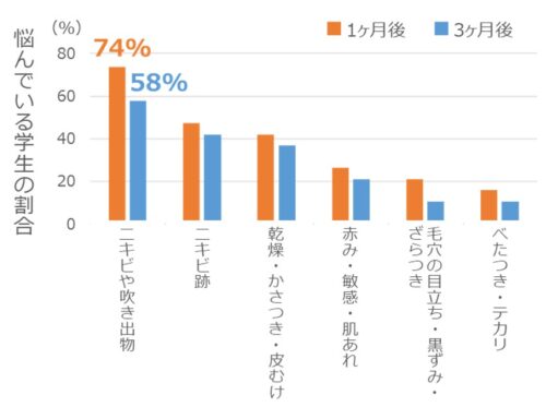 まず、スキンケアの習慣化による、肌悩みの変化を検証しました。中高生の最大の悩みである「ニキビや吹き出物」は、スキンケア使用1ヶ月後では74%が悩んでいたものの、3ヶ月後には58%に減少しました(図4)。その他の肌悩みも減少が確認できました。