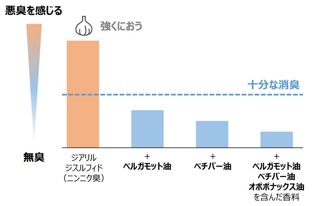 以上から、ベルガモット油、ベチバー油、オポポナックス油を組み合わせることで、「寝不足臭」に含まれるジアリルジスルフィドのにおいを効果的に抑える香りを開発することができました。