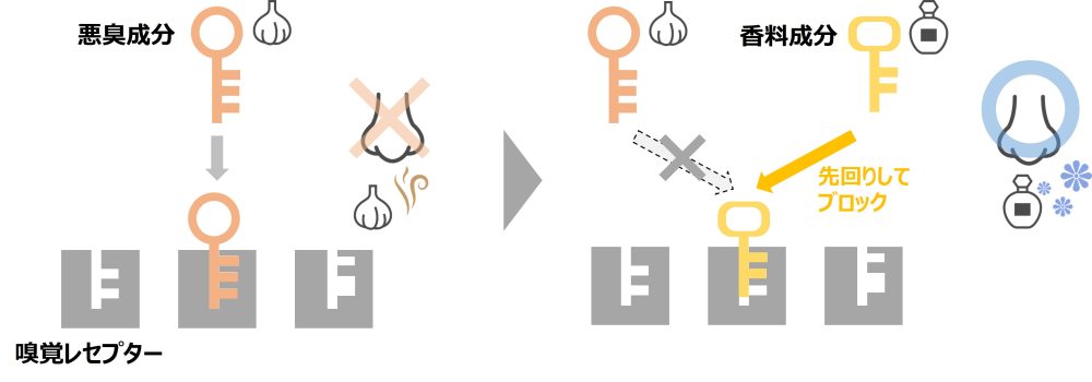 悪臭を抑制するもう一つのアプローチとして、鼻にある臭いを感じる器官である嗅覚レセプターの特性を応用した「レセプターロック技術」があります。ヒトには約400種の嗅覚レセプターがあるといわれており、におい成分がレセプターと結合することでそのにおいを認識する、鍵(におい成分)と鍵穴(レセプター)のような仕組みをとっていることが知られています。「レセプターロック技術」は、悪臭とは別のにおい成分がレセプターに結合することで、悪臭成分がレセプターと結合できないようにして、悪臭を感じにくくさせる手法です(図3)。ジアリルジスルフィドと同様のレセプターに結合する天然香料としてオポポナックス油が知られており、このオポポナックス油とベルガモット油、ベチバー油を含んだ香料を使用することで、「ハーモナージュ効果」のみよりも高い悪臭抑制効果を実現できることが明らかとなりまし(図1)。