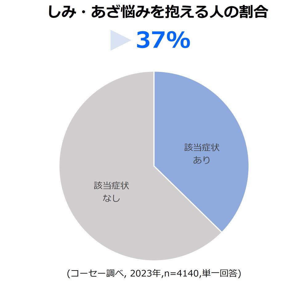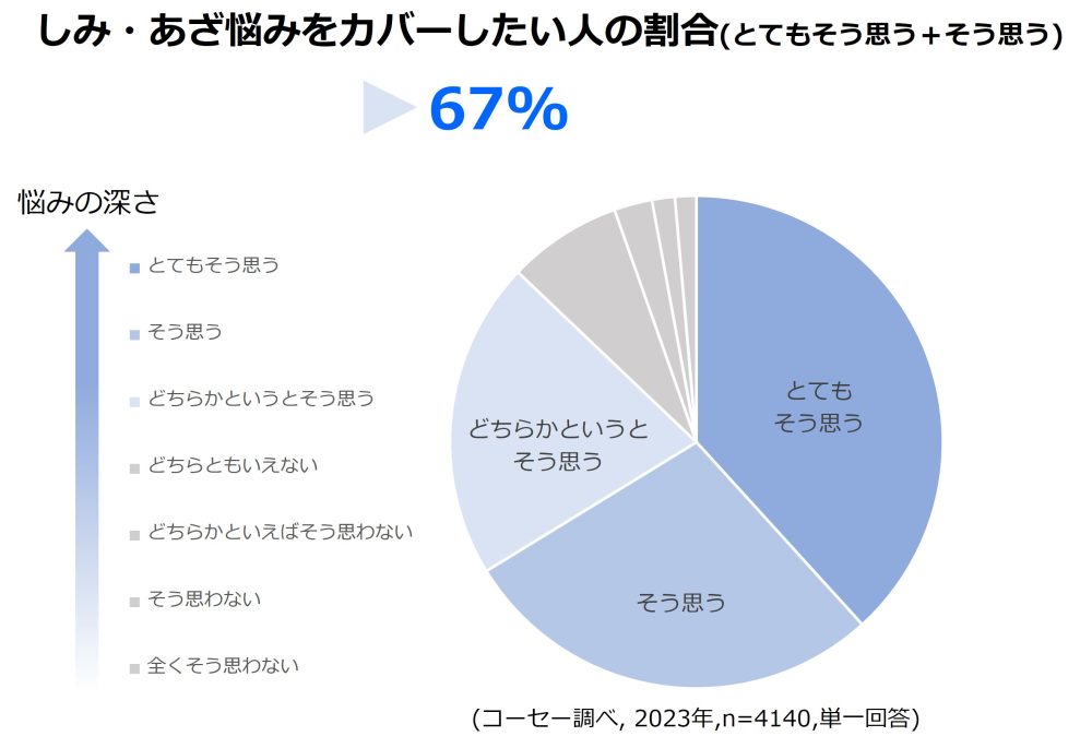 しみやあざは、当事者の生活の質QOLに大きな影響を与える深刻な悩みです。当社はこの悩みの実態を把握すべく、15~69歳の日本人男女を対象に大規模なインターネット調査を実施しました。その結果、しみ・あざに対して何らかの悩みを抱える人の割合は約4割を占め、そのうち約7割の人が「肌悩みをカバーしたい」という強い意向を示していることが確認できました。