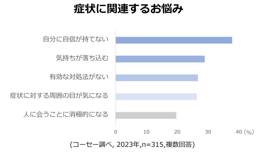 アンケートの回答からは、肌悩みがあることで「自分に自信が持てない」「気持ちが落ち込む」「周囲の目が気になる」といった回答が多く、肌の症状が心理的な負担や社会参画の障壁となっている現状が分かりました。本調査により、しみ・あざは普遍的に存在する肌悩みであり、それは深刻な「社会的・心理的な課題」であることが浮き彫りになりました。さらに、「有効な対処法がない」も回答上位に挙がっていることから、市販されている化粧品を使うだけで簡単に解消できる悩みではないことが伺えました。