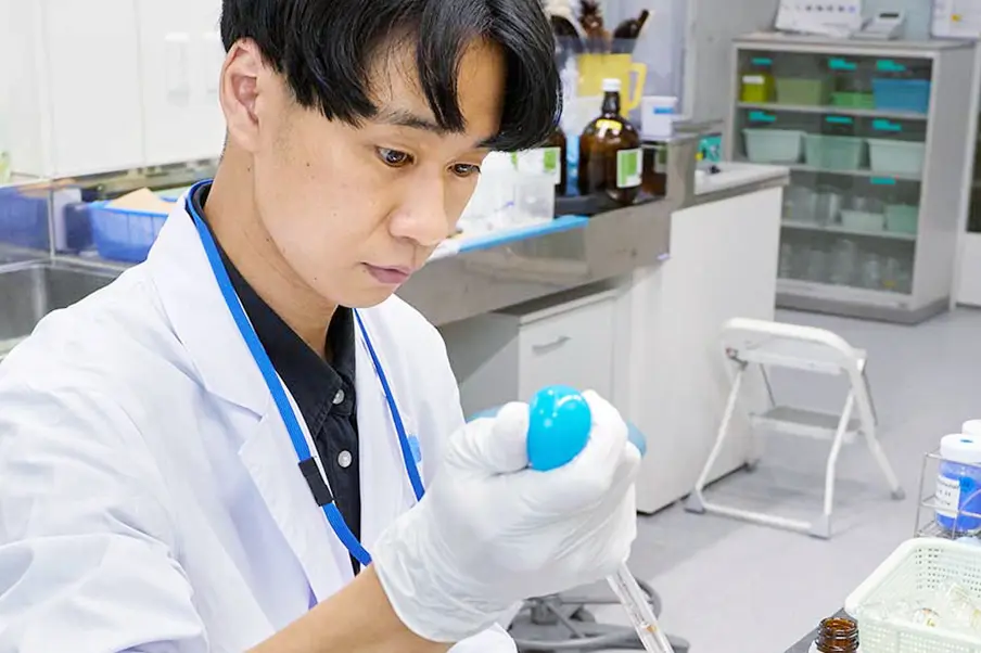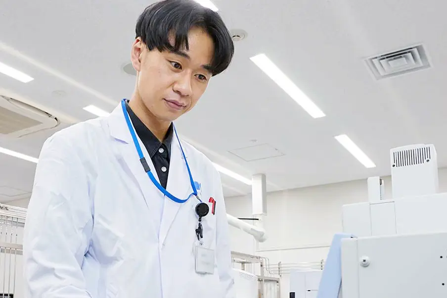 入社後は分析グループに所属し、化粧品の品質評価を行っています。化粧品を「化学的に評価する」ことで、新たに化粧品の価値を発見できることに魅力を感じ、現部署への配属を希望しました。