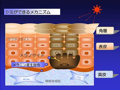 加齢とともに現れるシミは、皮膚科学では色素沈着症と呼ばれます。その種類はさまざまですが、特に紫外線によって悪化する傾向にあるのが、肝斑や老人性色素斑、雀卵斑(そばかす)です。これらが形成されるのは、皮膚の中の「メラノサイト」と呼ばれる細胞が、メラニンと呼ばれる色素を過剰に生成するためです。コウジ酸は、メラノサイトが過剰なメラニンを産生するのを抑制することで、美白作用を発揮します。