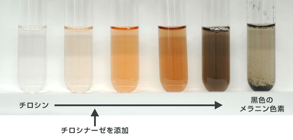 メラニンは、アミノ酸の一種であるチロシンに、チロシナーゼという酵素が働きかけることで、黒色の色素へと化学変化します。チロシナーゼは、銅イオンを持つことによって、活性状態になります。コウジ酸は、チロシナーゼから銅イオンを奪い取ることのできる「キレート作用」により、メラニンの産生を抑制し、美白作用を示すのです。