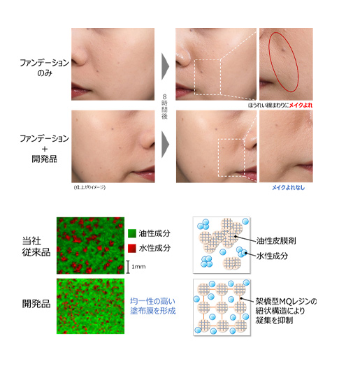 今回、時間経過や表情などの顔の動きによる「メイクよれ」を防ぐ効果をさらに高めるため、強靭でありながら柔軟な皮膜をつくる新素材「架橋型MQレジン」を開発。これは均一性の高い塗布膜を形成し、長時間つけても負担感がない品質にもつながっています。本素材は同商品のリニューアルに応用されています。