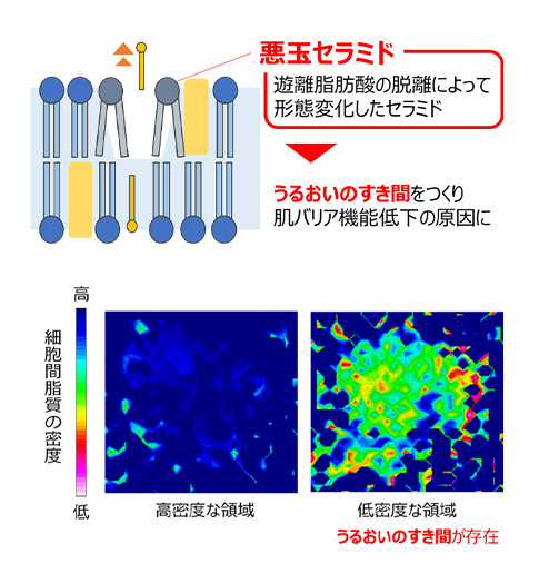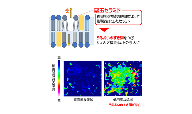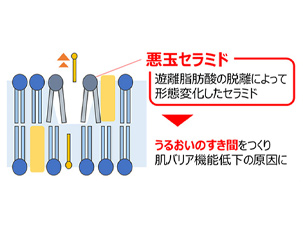 コーセーでは、このバリア機能が低下する要因のひとつ「悪玉セラミド」を発見しました。これは肌のすきまを埋める成分であるセラミドの形が変化してしまうもので、それにより乾燥しやすい「うるおいのすき間」が生じてしまいます。また、この悪玉セラミドの発生を抑えるためには「アセチルアミノ酸」という成分が有効であることを見出しました。