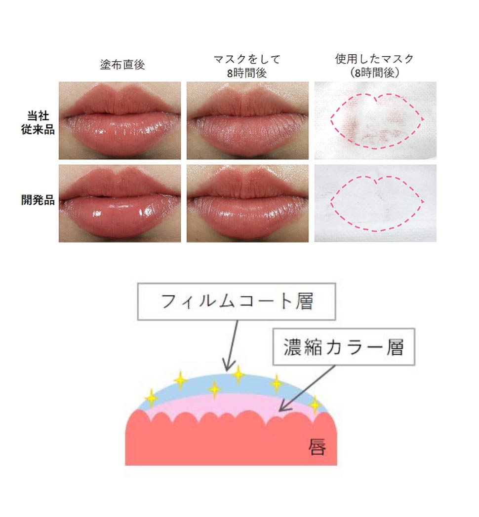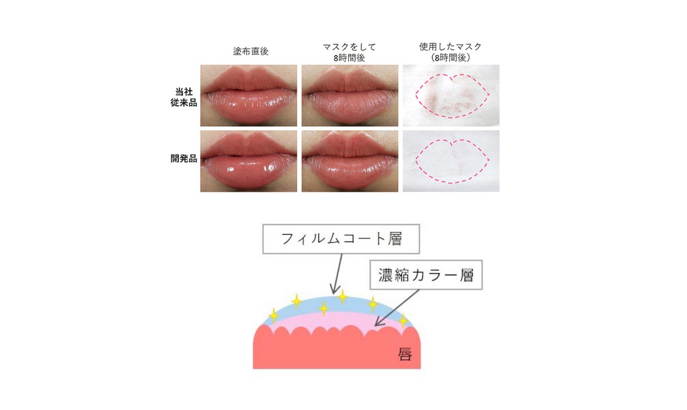またマスクのつけ外しが増えている中でも、色味やイキイキとしたツヤ感が持続するよう、フィルムコート層分離技術を取り入れ、仕上がり効果が持続する口紅技術の開発に取り組んでいます。
