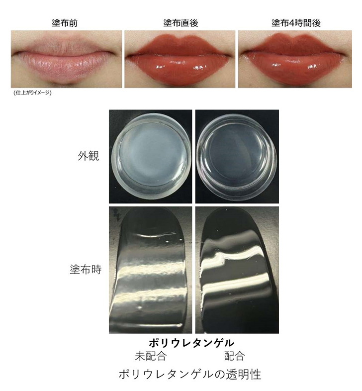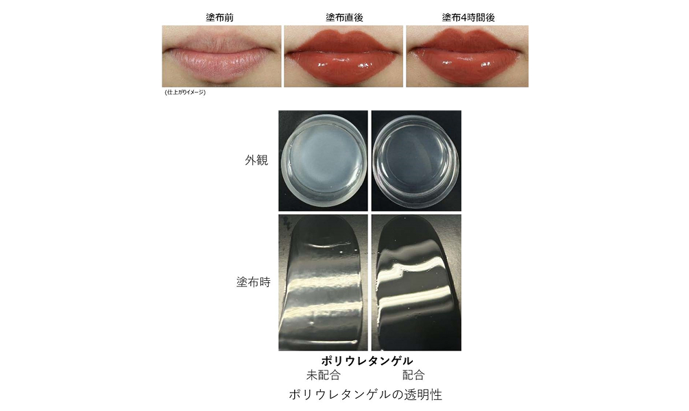 コーセーでは、高い透明性と立体性、そして柔軟性を併せ持つポリウレタンゲルを応用し、新たな口紅製剤を開発しました。
