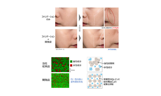 今回、時間経過や表情などの顔の動きによる「メイクよれ」を防ぐ効果をさらに高めるため、強靭でありながら柔軟な皮膜をつくる新素材「架橋型MQレジン」を開発。これは均一性の高い塗布膜を形成し、長時間つけても負担感がない品質にもつながっています。本素材は同商品のリニューアルに応用されています。